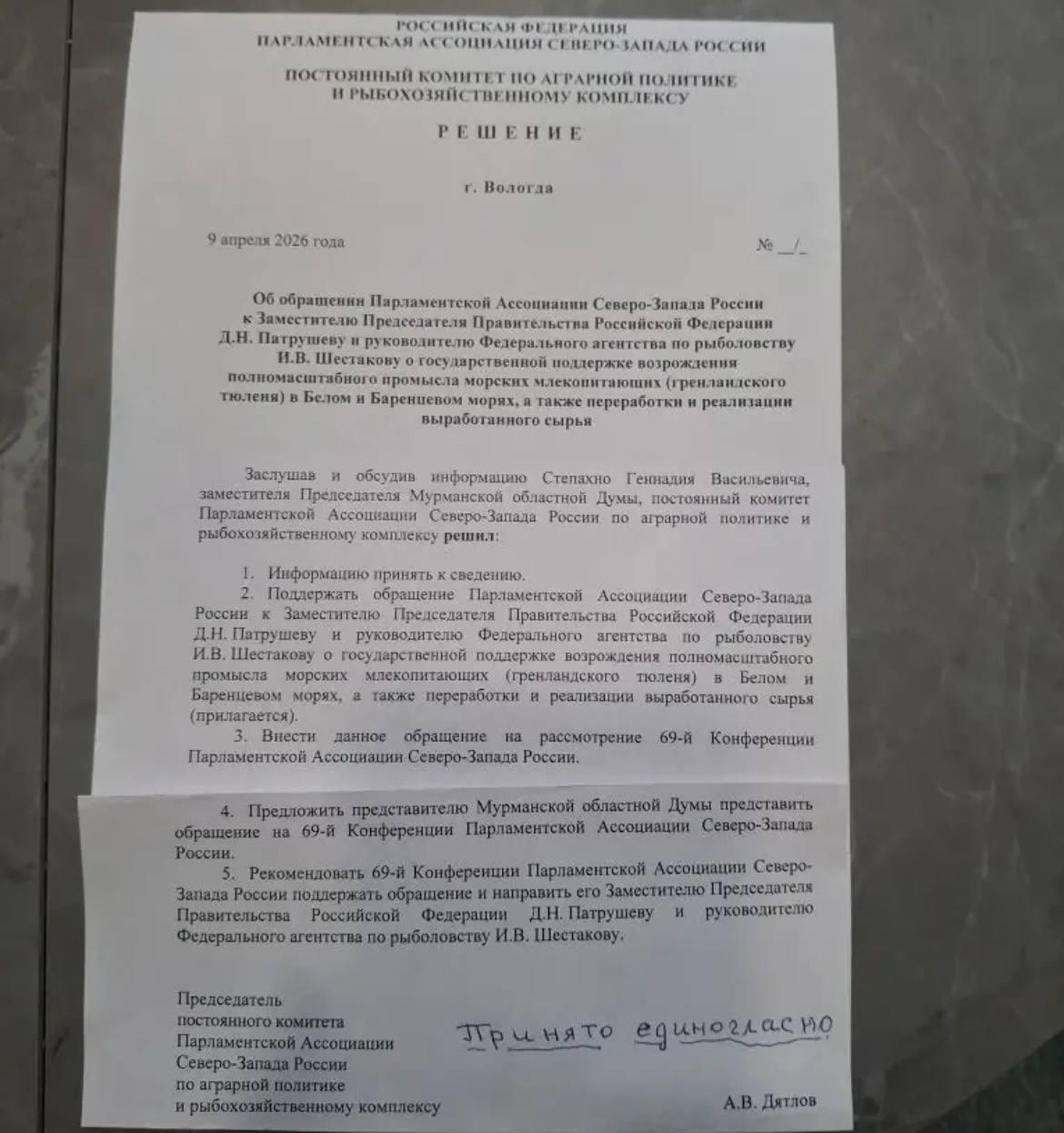 Постоянный комитет Парламентской Ассоциации Северо-Запада России выступил за возобновление и государственную поддержку масштабного промысла гренландского тюленя в арктических морях.
