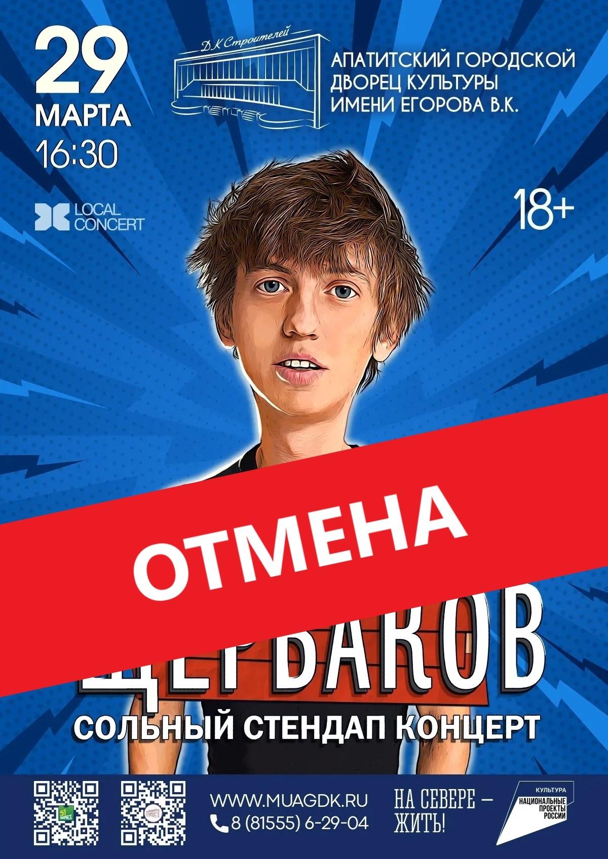 Апатитский городской дворец культуры сообщил об отмене двух стендап-концертов Алексея Щербакова, запланированных на 29 марта.