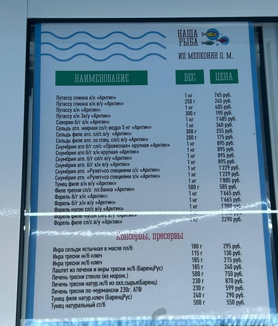 Сельдь представлена в нескольких вариантах: жирная слабосоленая стоит около 360 рублей за килограмм, а филе в упаковке — примерно 175 рублей за 200 грамм. Скумбрия атлантическая (слабосоленая и копченая) продаётся в среднем по 895 рублей за килограмм, а рулеты из неё — от 1229 до 1885 рублей за килограмм.