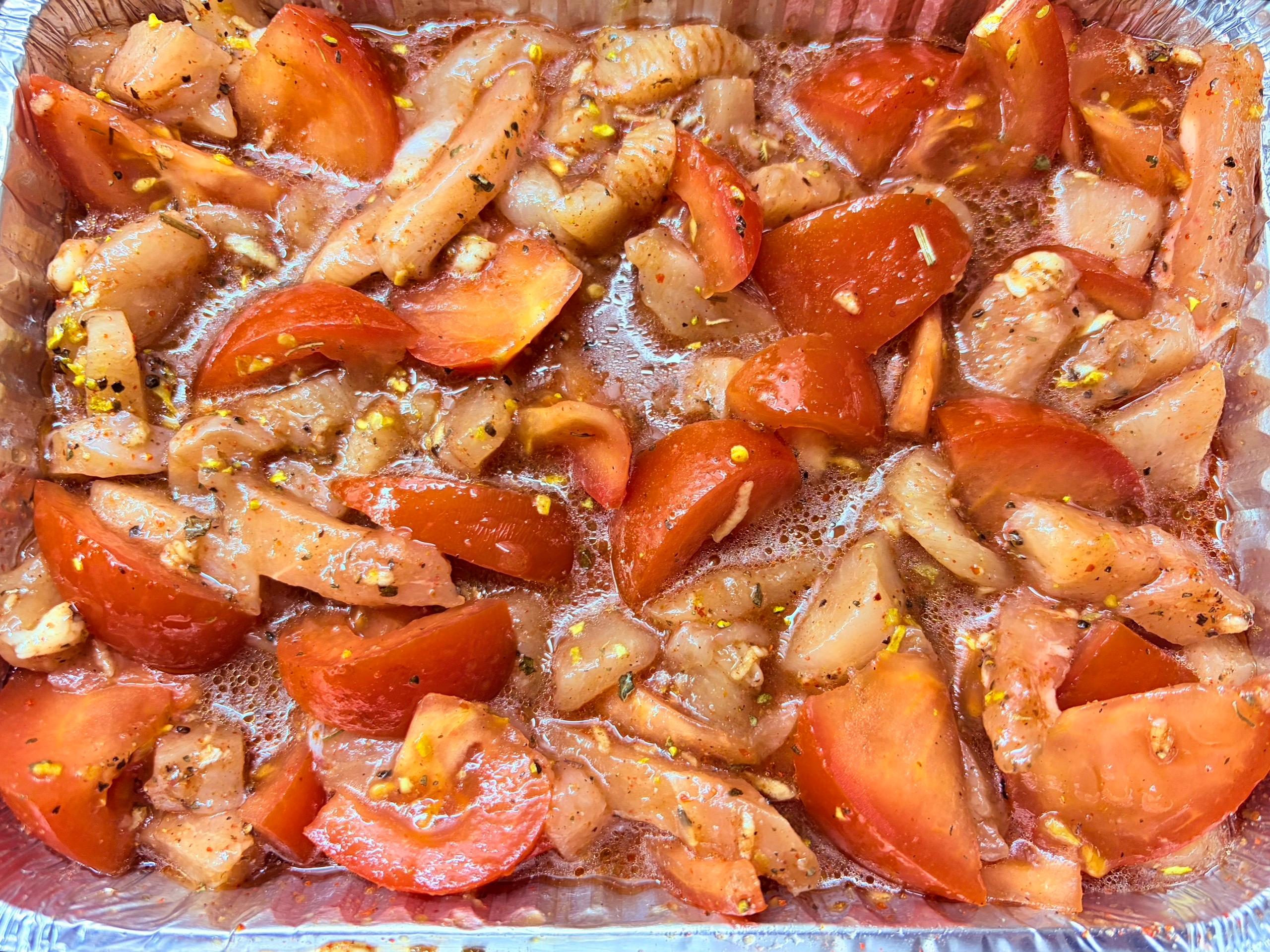 - Возьмите грудку и помидоры в соотношении 1:1. Курицу нарежьте соломкой, томаты — крупными кусками. Сложите ингредиенты в форму для запекания.
