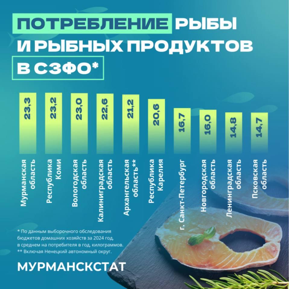 Наименьшее количество рыбы включают в свой рацион жители Псковской (14,7 кг) и Ленинградской (14,8 кг) областей.
