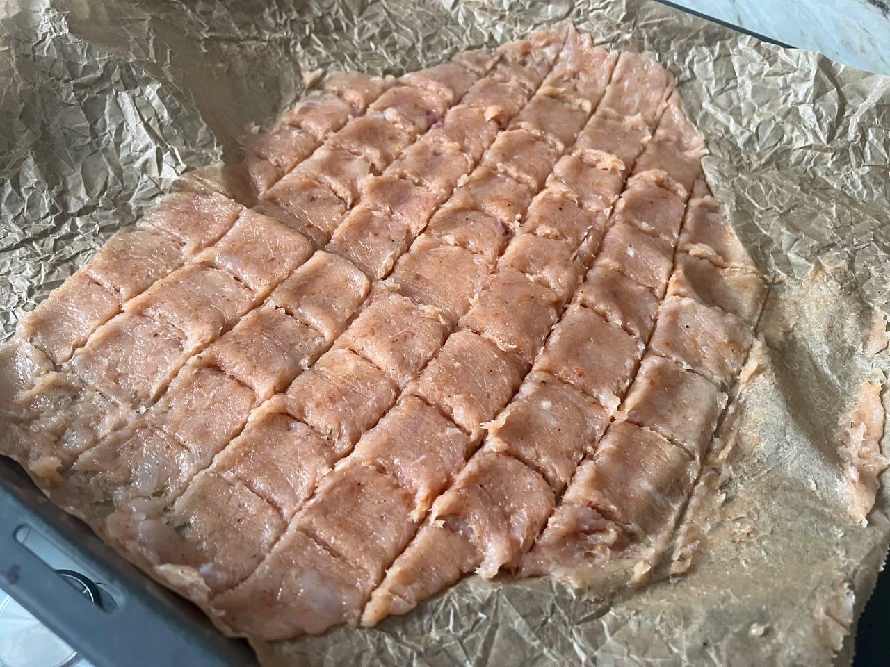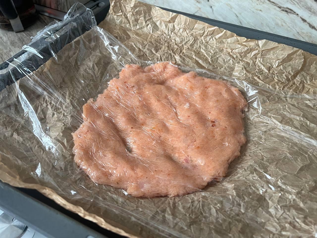 Застелите противень листом пергамента. Выложите куриную массу и разровняйте её тонким слоем толщиной 2–3 мм. Удобно накрыть массу вторым листом пергамента и раскатать скалкой.