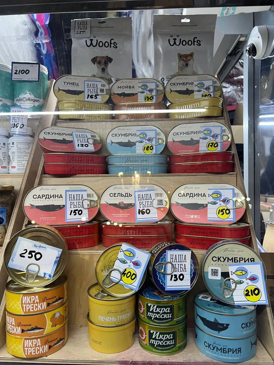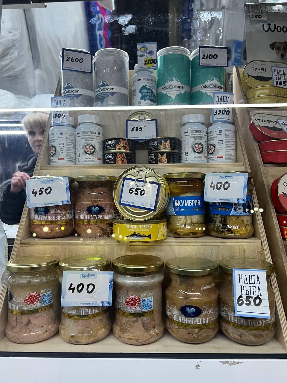 Наиболее дорогим консервированным продуктом является печень трески в полулитровой банке за 650 рублей. Вся продукция местного производства.