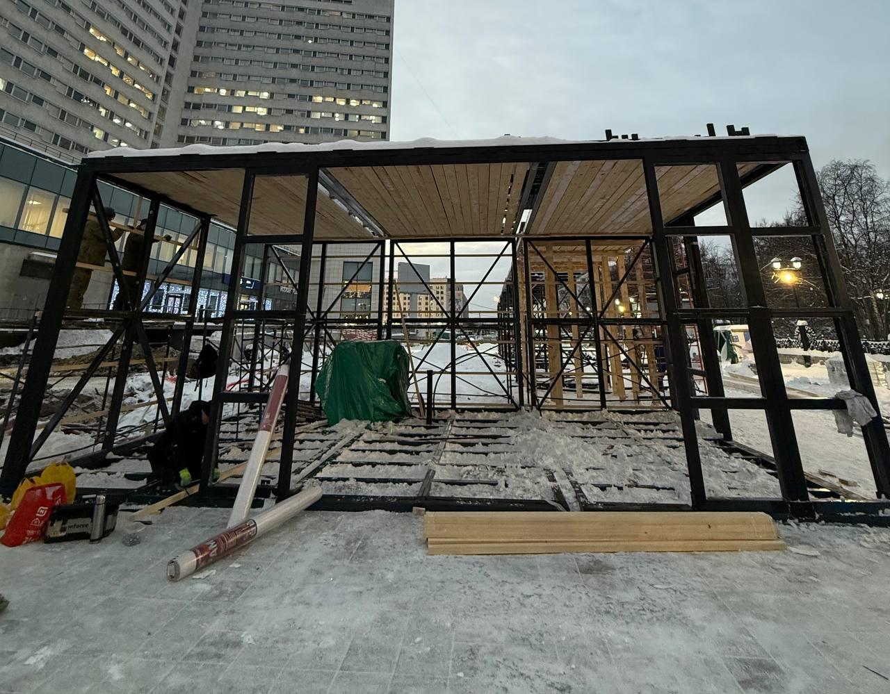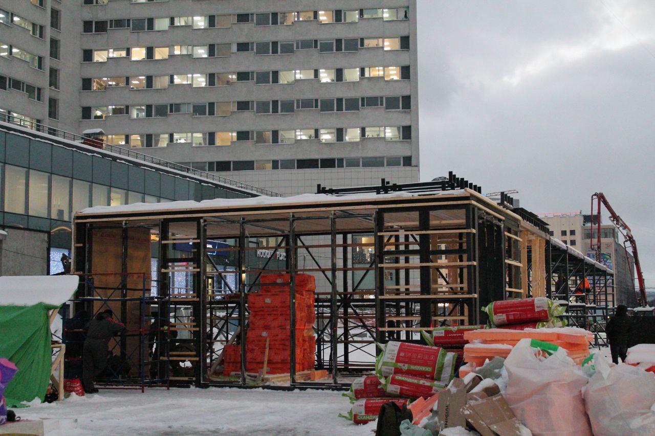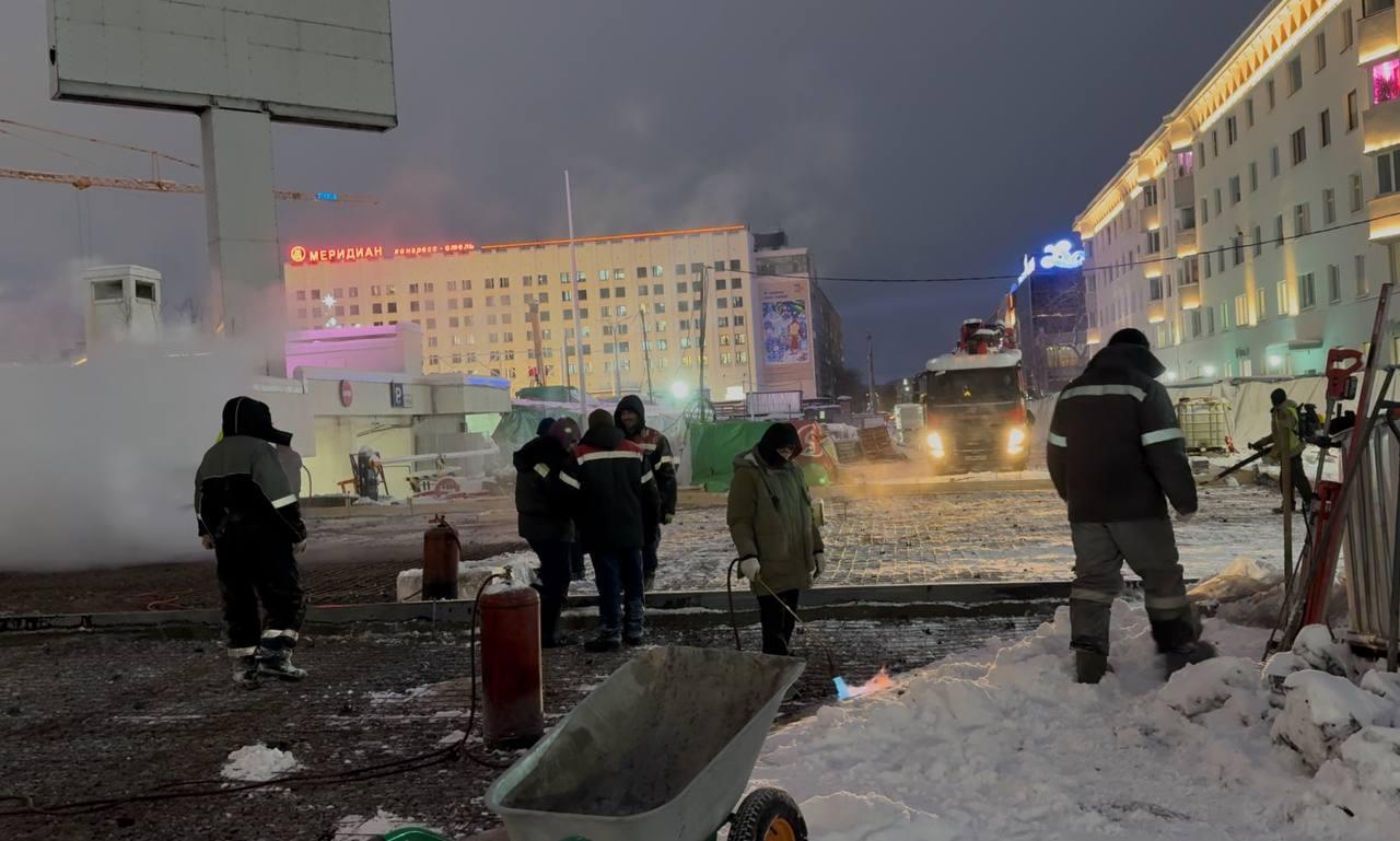 Для основания под тротуарную плитку уже залито 800 кубометров бетонной смеси. Мощение выполнено примерно на 35%. Работы ведутся в утеплённых шатрах с поддержанием температуры от +5 до +10 градусов, что позволяет работать круглосуточно.