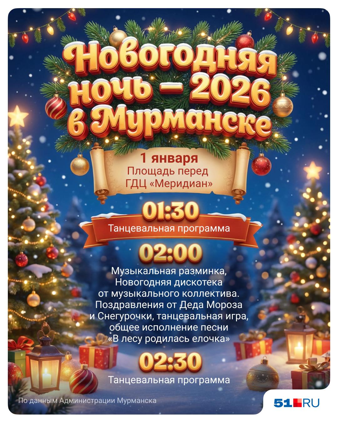 Жителей и гостей Мурманска приглашают встретить Новый год у главной городской елки. В программе — ночные развлечения и специальное транспортное обслуживание.