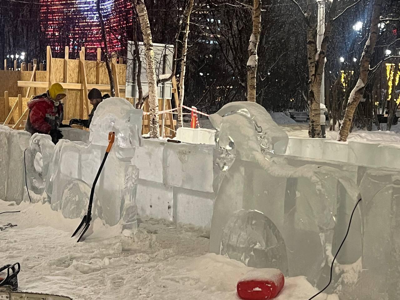 В Мурманске начался монтаж ледяных скульптур, приуроченных к новогодним праздникам. Первые фигуры уже монтируют на улице Воровского.