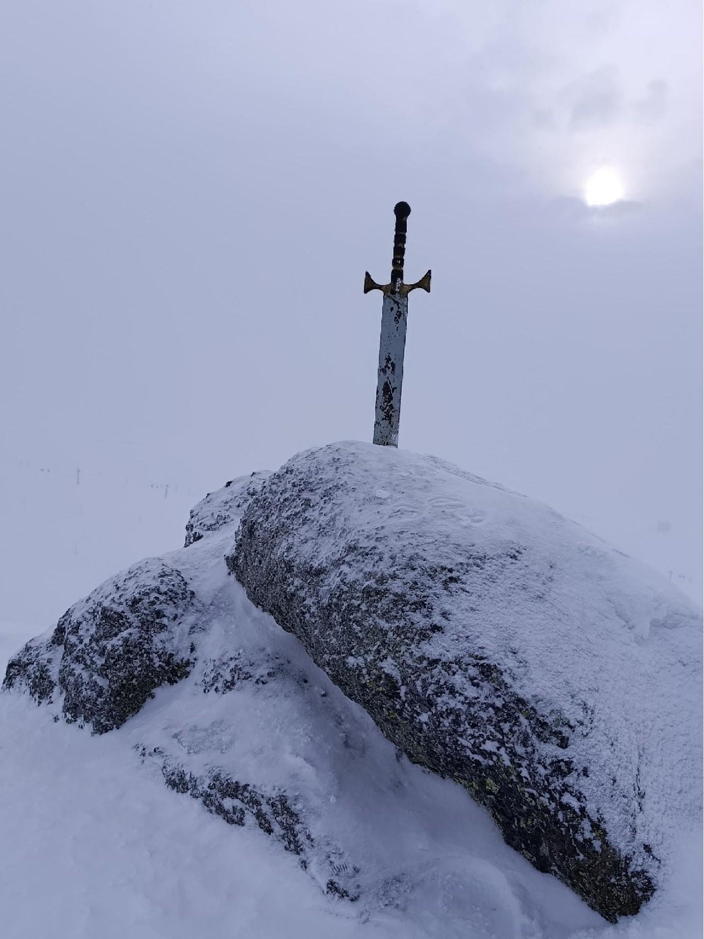 Потом решила подняться ещё выше пешком. Там, среди занесённых снегом смотровых площадок, нашёлся даже «меч в камне». Разглядеть далёкие горы в тот день не удалось — видимость была плохой.