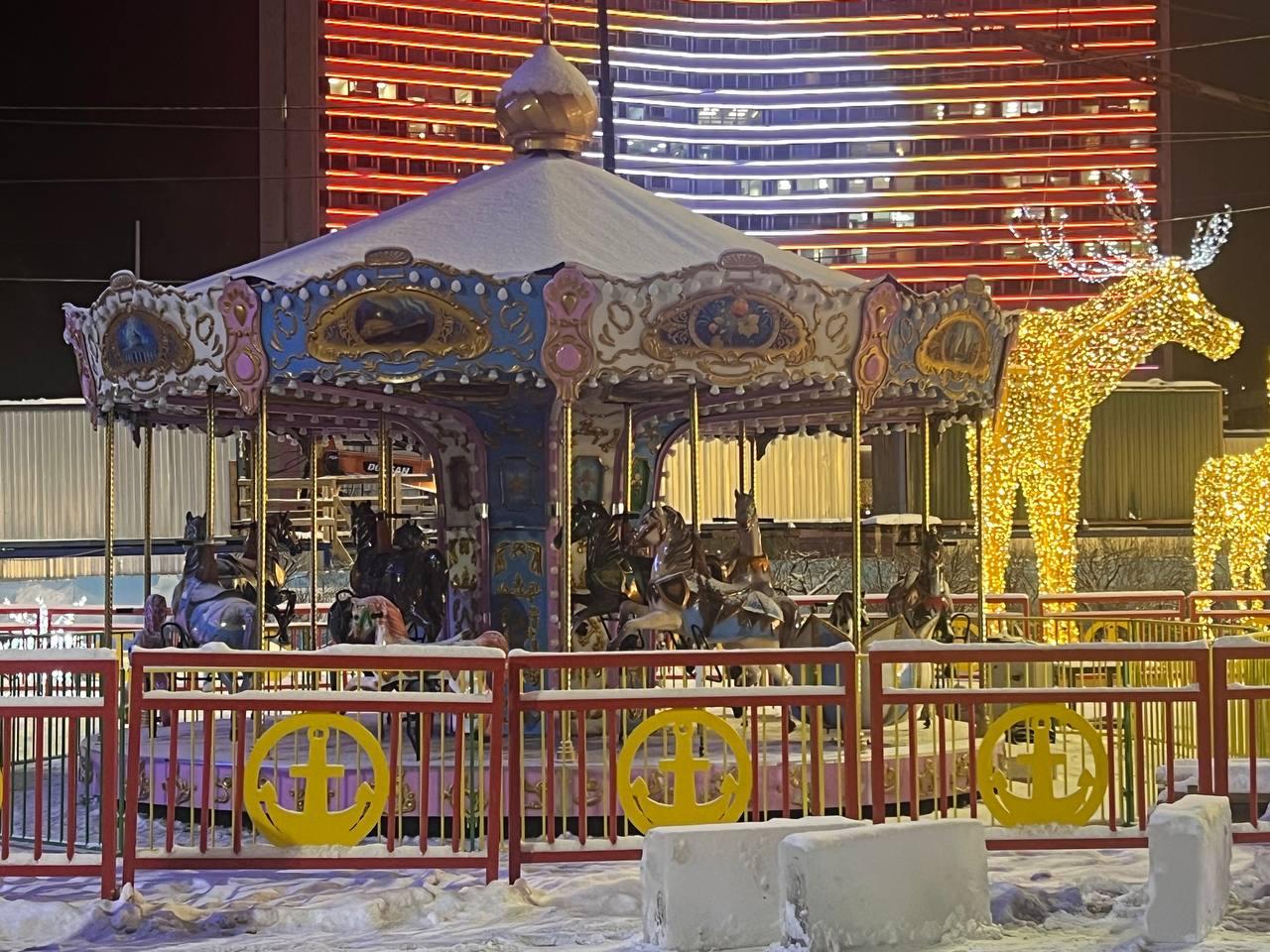 На центральной площади Мурманска, у главной городской ёлки, запустили новогоднюю карусель, украшенную декоративными лошадками.