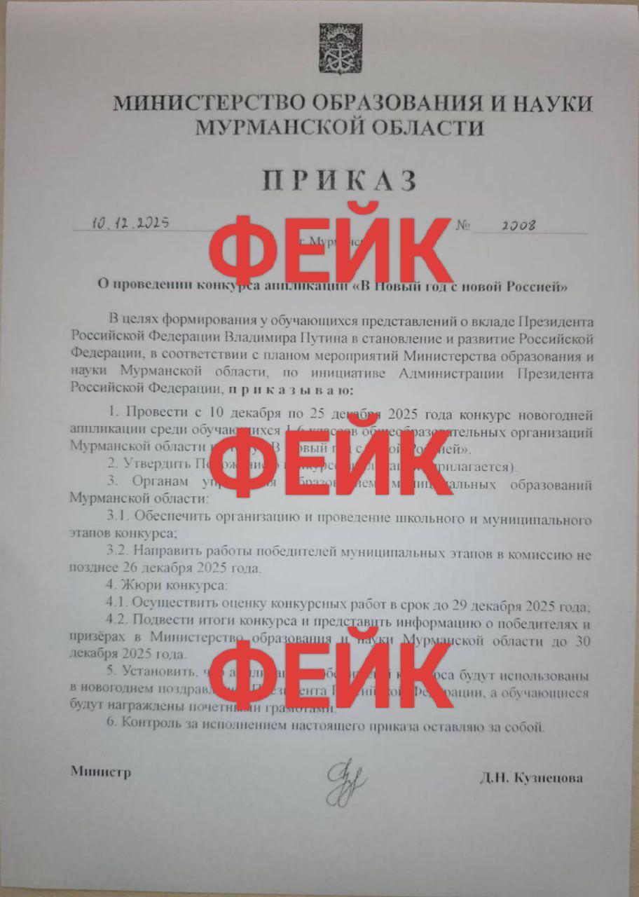 В интернете появился в обращении сфальсифицированный документ, оформленный как приказ Министерства образования и науки Мурманской области. Региональные власти оперативно отреагировали, официально опровергнув его подлинность и назвав публикацию вбросом.