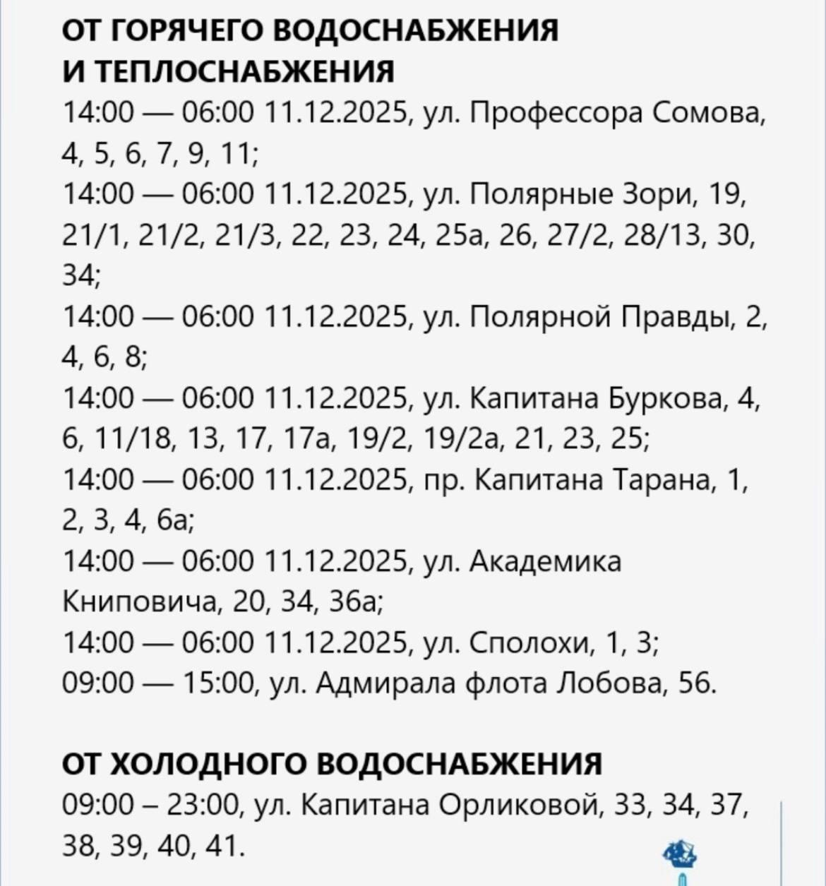 Городская администрация Мурманска сообщила о проведении плановых работ на коммунальных сетях, которые потребуют временного отключения электричества, газа и отопления в ряде жилых домов 10 декабря.