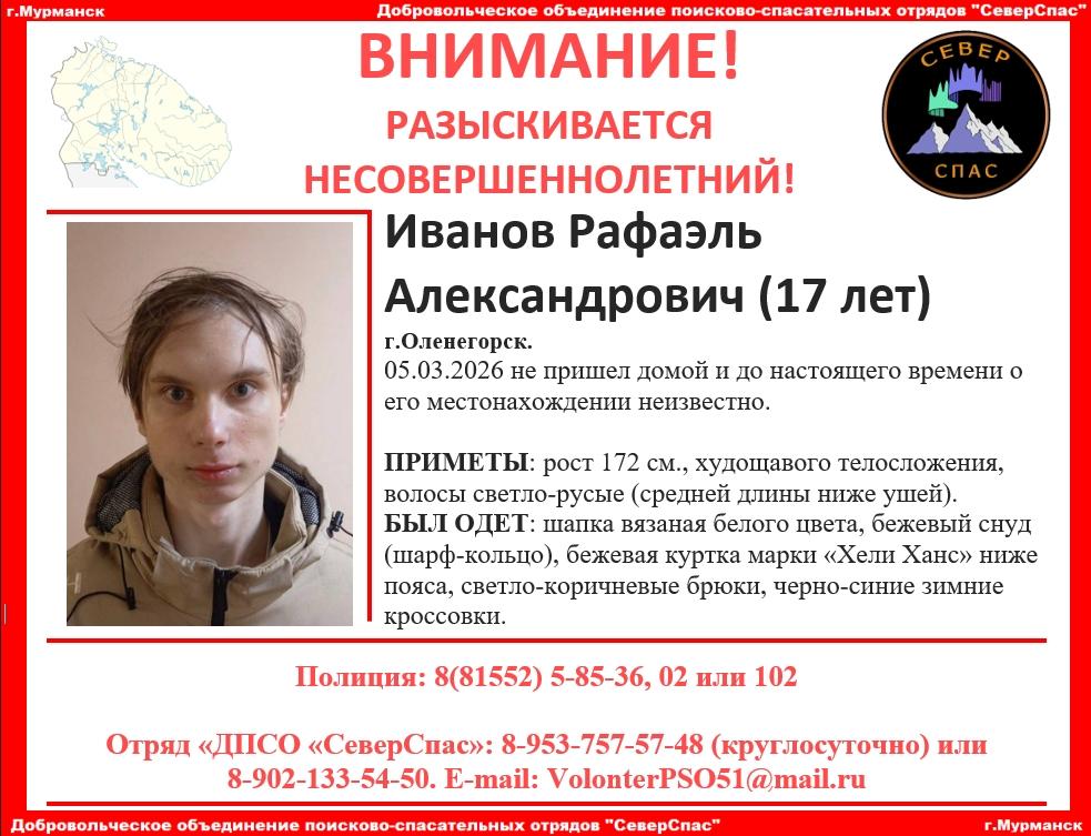 В Оленегорске Мурманской области продолжаются поиски подростка Рафаэля Иванова, который не вернулся домой 5 марта и с тех пор не выходил на связь.