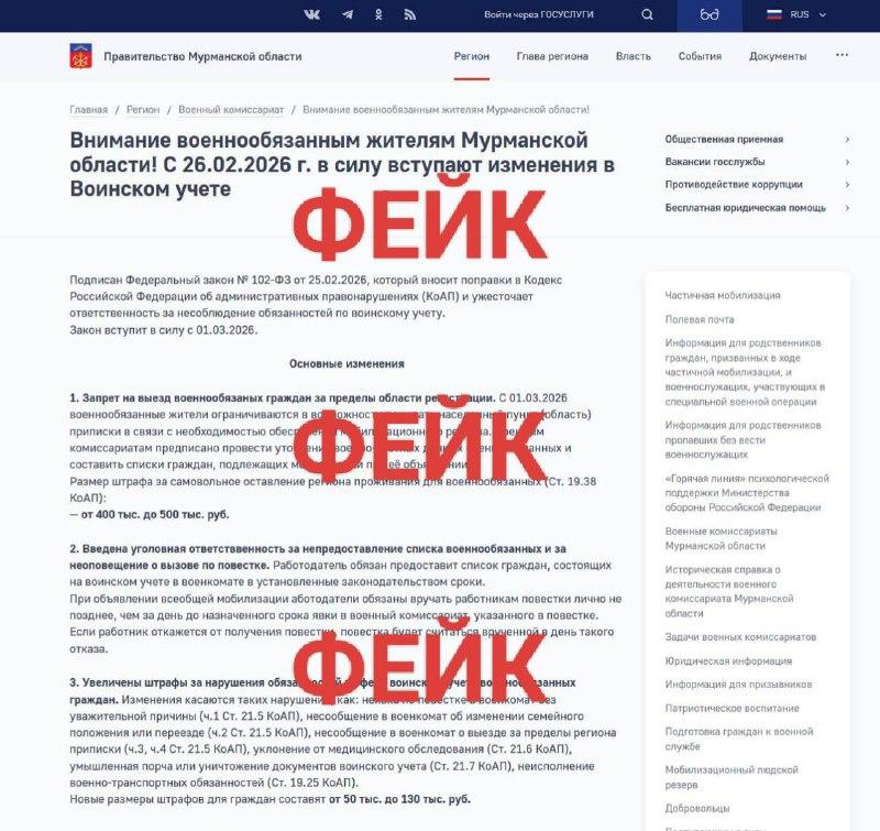 В мурманских сообществах социальных сетей появился фальшивый скриншот с сайта областного правительства. В документе утверждалось, что с 1 марта военнообязанным гражданам будет запрещено покидать свой населенный пункт или регион регистрации. Подобная мера, согласно фейку, вводилась для пополнения мобилизационного резерва.