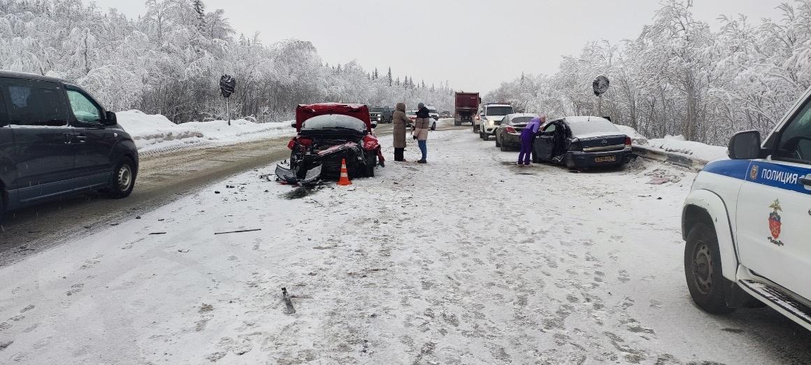 Первая авария произошла 6 февраля в 01:20 на трассе Пиренга — Ковдор. Водитель автомобиля «Лада-Веста», не справившись с управлением из-за превышения скорости и неблагоприятных дорожных условий, выехал на встречную полосу и совершил лобовое столкновение с ВАЗ-21043. Водитель ВАЗ, 1993 года рождения, получил множественные повреждения и позднее скончался в реанимации. Сам водитель «Лады» и два пассажира, 2008 и 2010 годов рождения, были доставлены в медицинское учреждение.