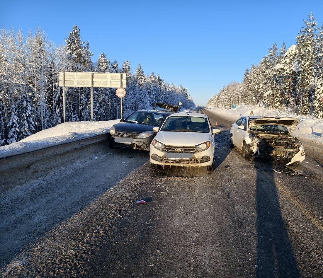 7 февраля в 11:00 на 1116-м километре федеральной трассы «Кола» водитель «Хендай Акцент» потерял контроль над управлением и врезался в остановившийся на светофоре в зоне дорожных работ «Рено-Сандеро». От удара «Рено» столкнулся с «Ладой-Грантой». Водитель «Рено» был госпитализирован в травматологическое отделение.