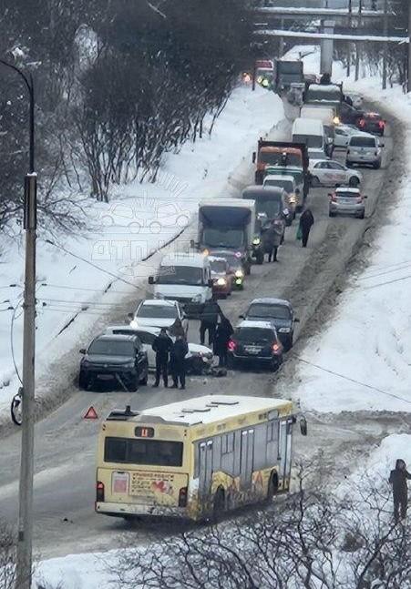 В Мурманске на улице Подгорная произошло дорожно-транспортное происшествие с участием трёх машин, спровоцировавшее образование огромной пробки. По данным свидетелей, проезд в обоих направлениях оказался невозможен, что вынуждает водителей разворачиваться.
